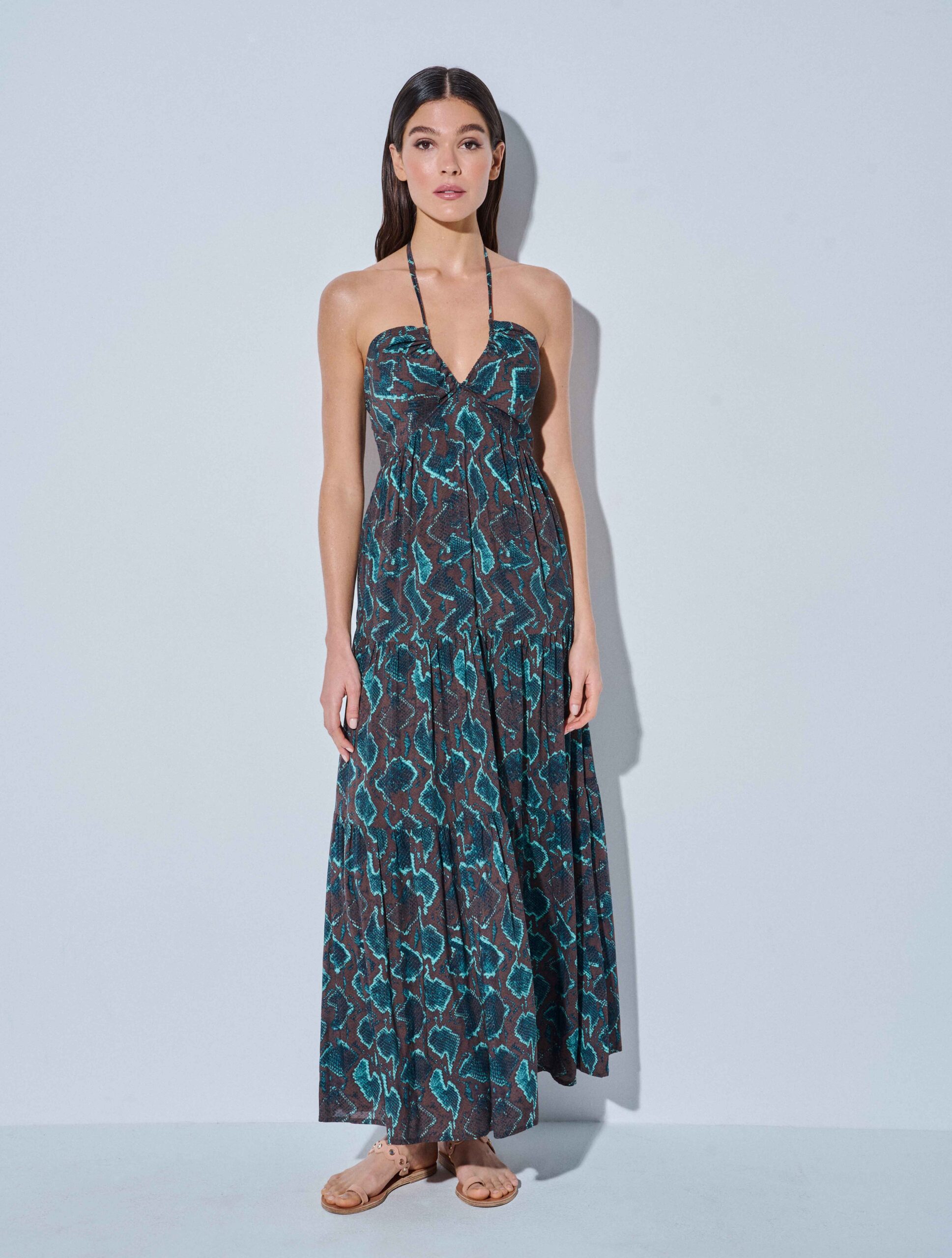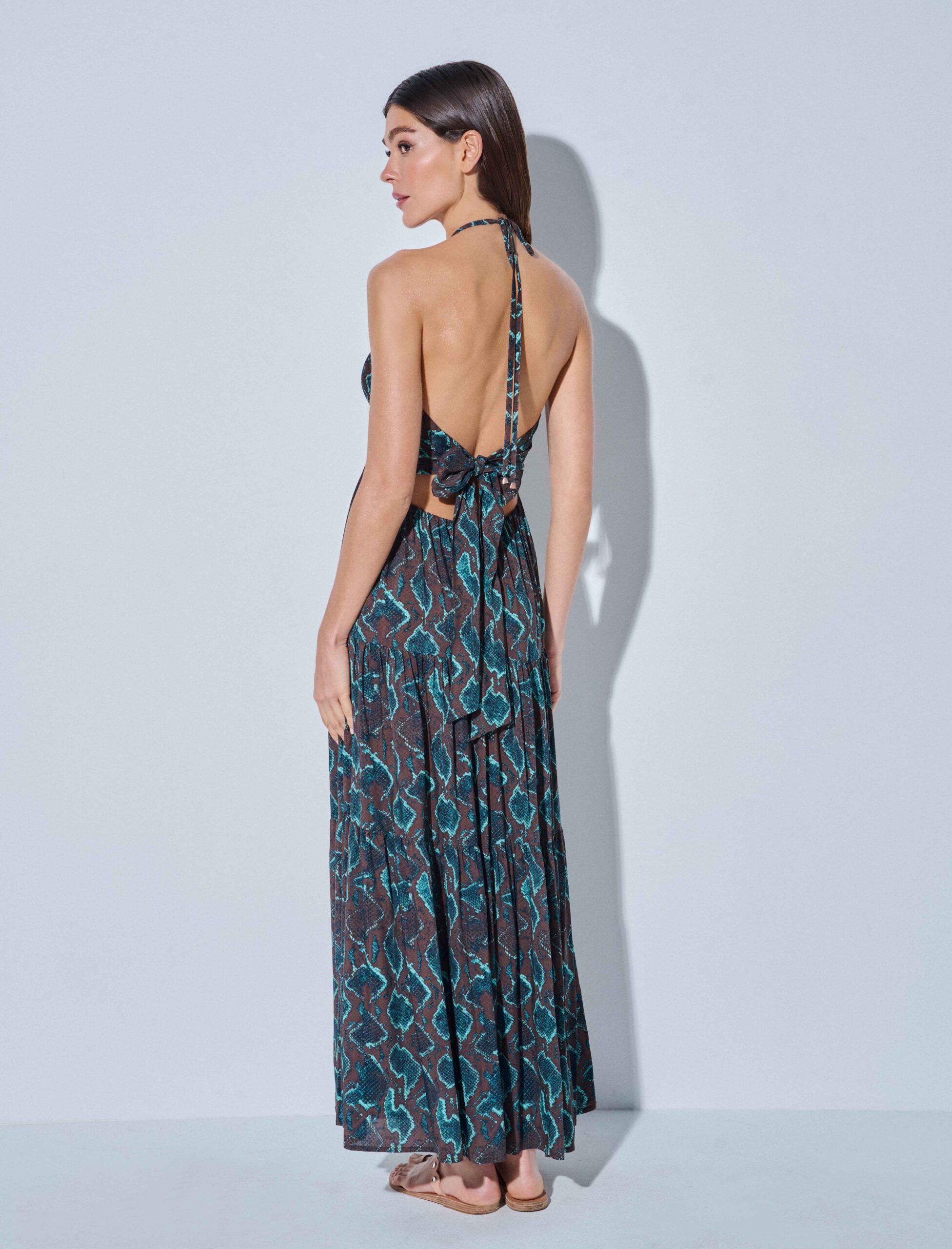 Μάξι φόρεμα από βισκόζη σε animal print φίδι. Το πάνω μέρος με κορδόνια στο ντεκολτέ δίνει την επιλογή για περισσότερη λιγότερη καλύψη και προσαρμόζεται με δέσιμο στο λαιμό και στην πλάτη. Το κάτω μέρος εφαρμόζει  με ελαστική μέση πίσω και παρουσιάζει δύο σειρές βολάν.